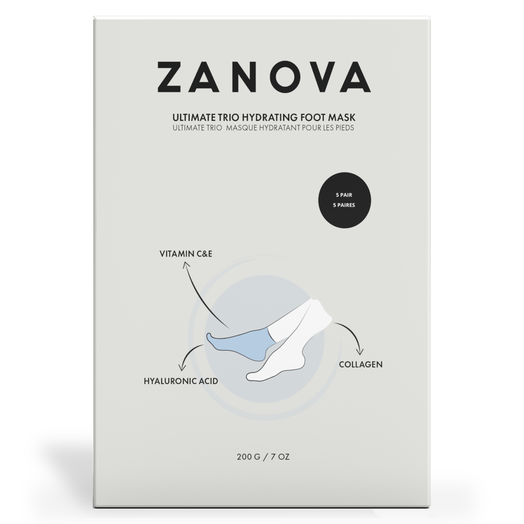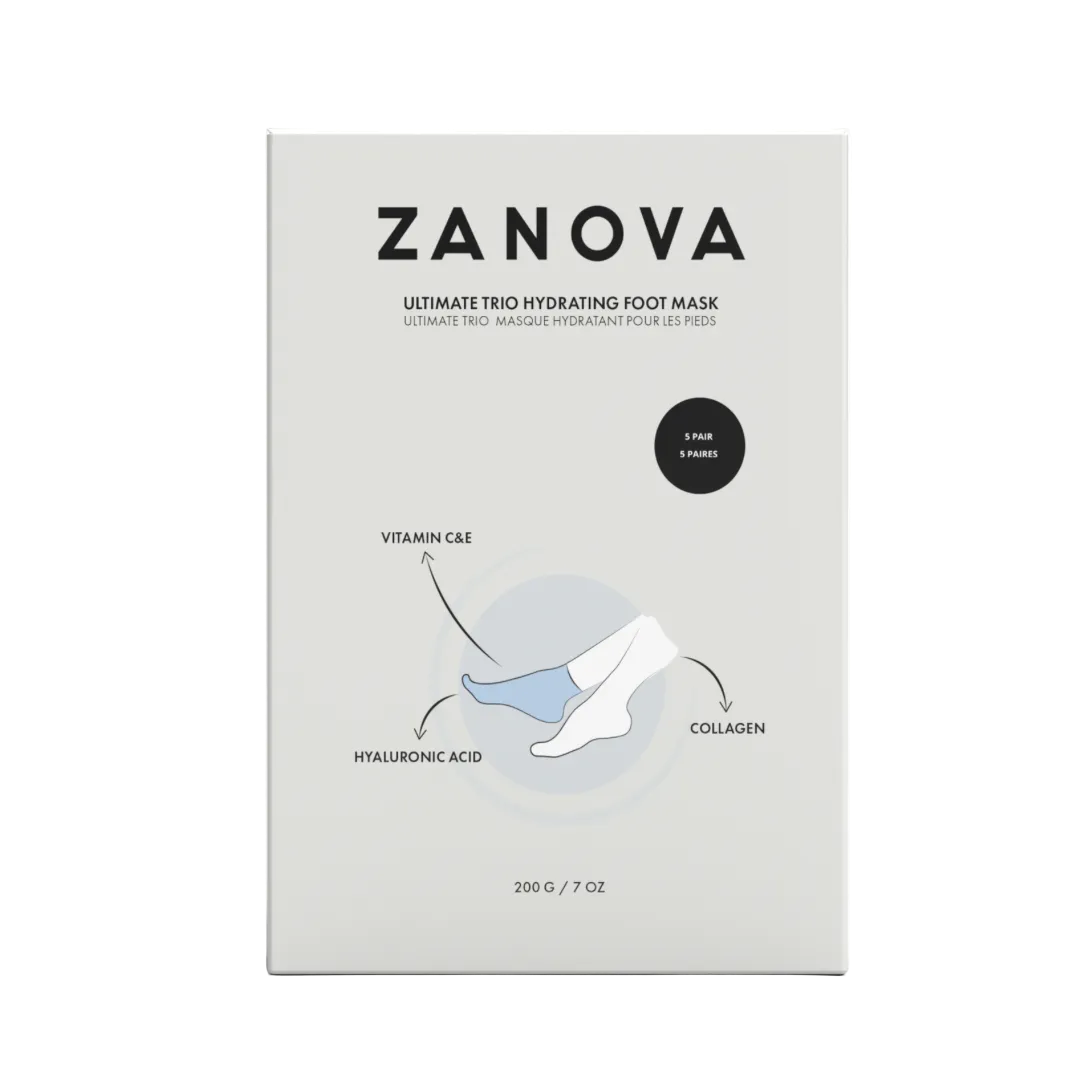 The Zanova Collagen Treatment Foot Mask promotes healthy skin and toenails on your feet. Infused with the Ultimate Trio - vitamin E and C, hyaluronic acid, and collagen - this foot mask provides ultimate hydration, supports skin healing, and enhances toenail health. It helps heal cracked heels, prevents skin dryness, aids in the healing of toenail breakage, and provides all-day hydration and protection for your feet in any shoes.