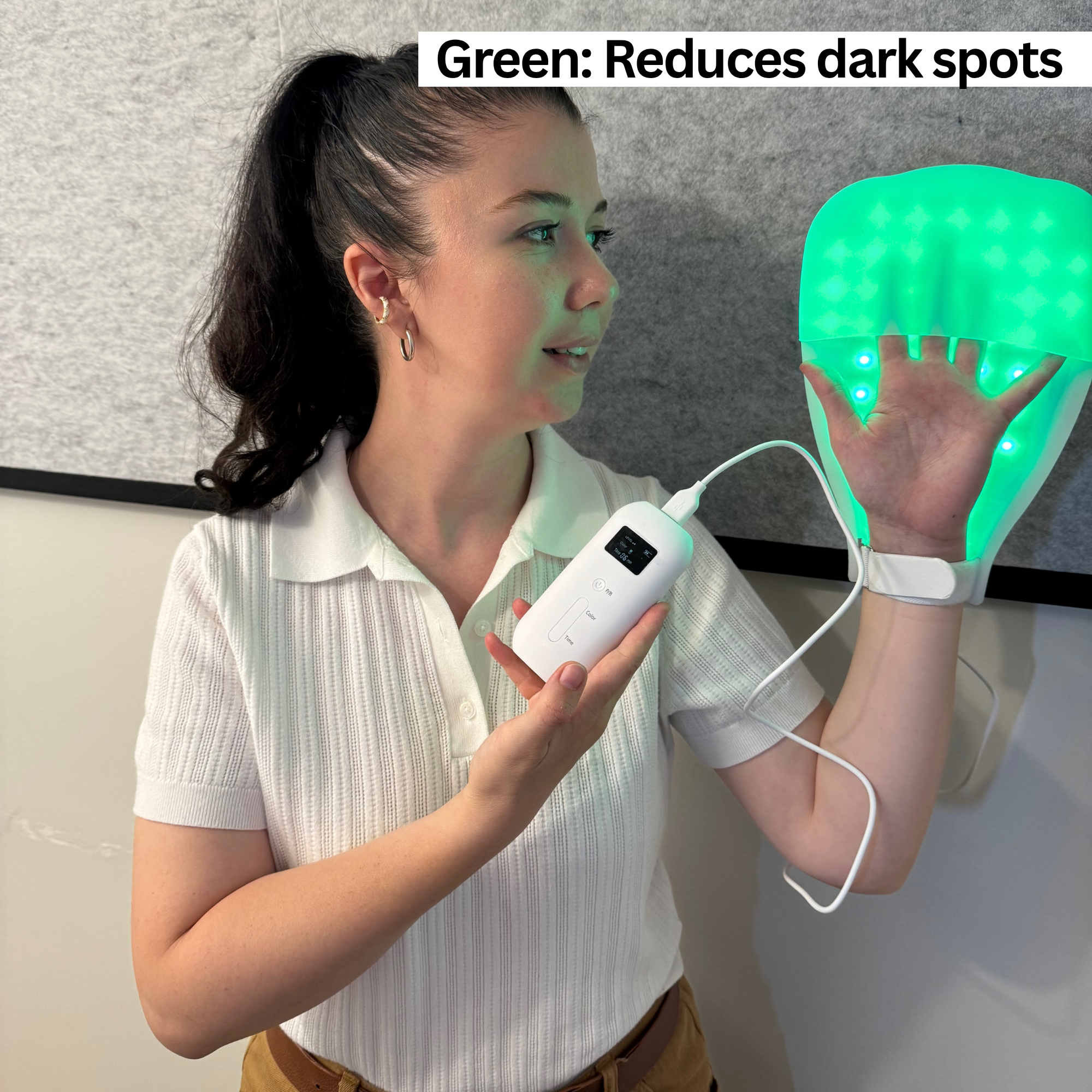 Green light balances pigmentation and calms overactive cells, making it ideal for fading dark spots on hands and reducing white marks on nails. It helps even out skin tone, refresh dull areas, and restore a clearer, more uniform look. Whether from sun exposure, discoloration, or nail damage, green light is your daily solution for smoother, more radiant hands.