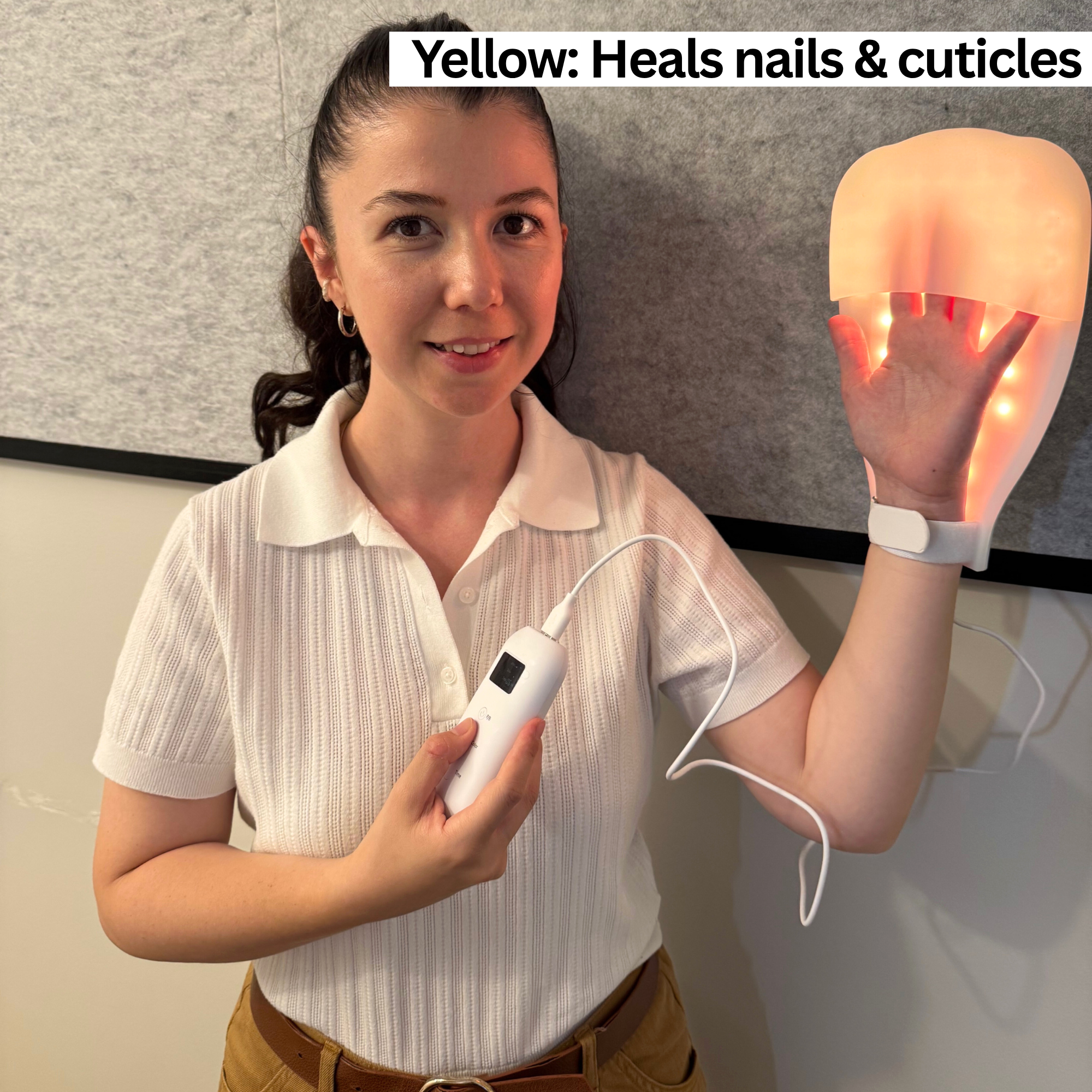 Yellow light stimulates circulation and cellular repair, making it ideal for nail growth and cuticle healing. It helps soothe inflammation, even out skin tone, and restore a smoother, healthier look to your hands. Whether you’re recovering from picking or just want a natural hand-care routine, yellow light is your go-to therapy.